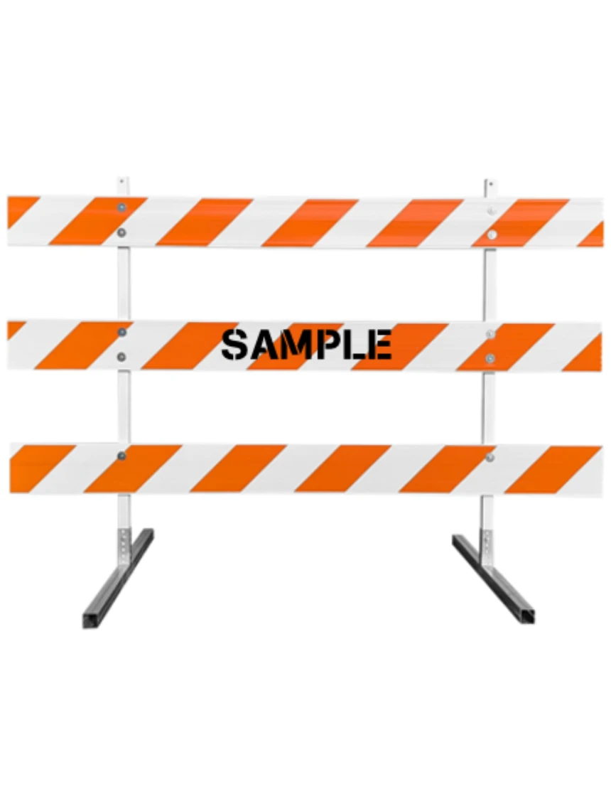63" Tall MUTCD Type III Barricade -Plastic Power Post Uprights, Square Steel Sign Post Feet & Three 8' Plastic Boards w/EG Sheeting On Both Sides Of Rails & Custom Lettering
