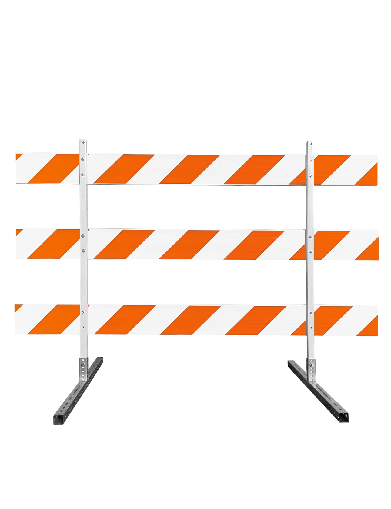 For projects that require maximum visual presence and dependable stability, the 8′ Power Post™ Type III Barricade with Square Steel Feet is built to perform. This full-length configuration combines impact-resistant Power Post™ uprights with rugged square steel tube feet, delivering a professional traffic control solution for wide lane closures, roadway construction, and long-term work zones.