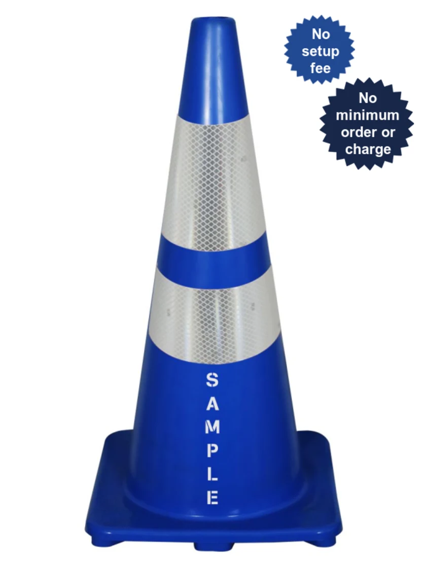 Solid Blue, 28", 5 lbs, Economy Cone w/ 6" & 4" Reflective Collars & Double Sided Custom Lettering