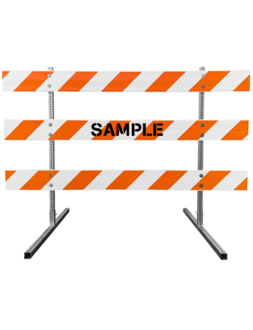 63" Tall MUTCD Type III Barricade -Square Steel Sign Post Uprights, Square Steel Sign Post Feet & Three 8' Plastic Boards w/HI Sheeting On Both Sides Of Rails & Custom Lettering