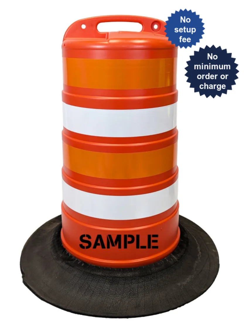 37" Tall Channelizer Drum w/Four 4" EG Reflective Stripes, Recycled Tire Base & Double Sided Custom Lettering