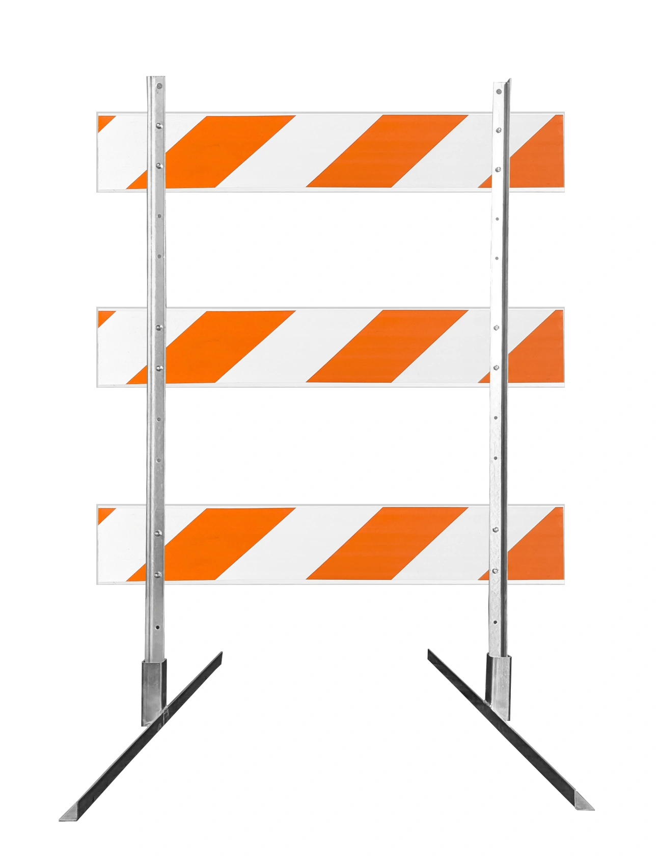 This barricade features 1.75" square galvanized steel sign post uprights paired with galvanized angle iron feet for a tough, stable setup that resists bending, twisting, and wind loads. It’s built to perform in high-traffic environments and harsh outdoor conditions.