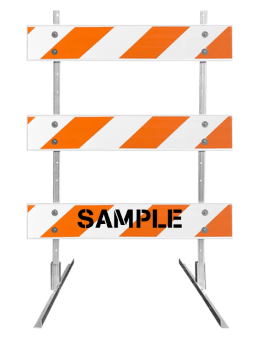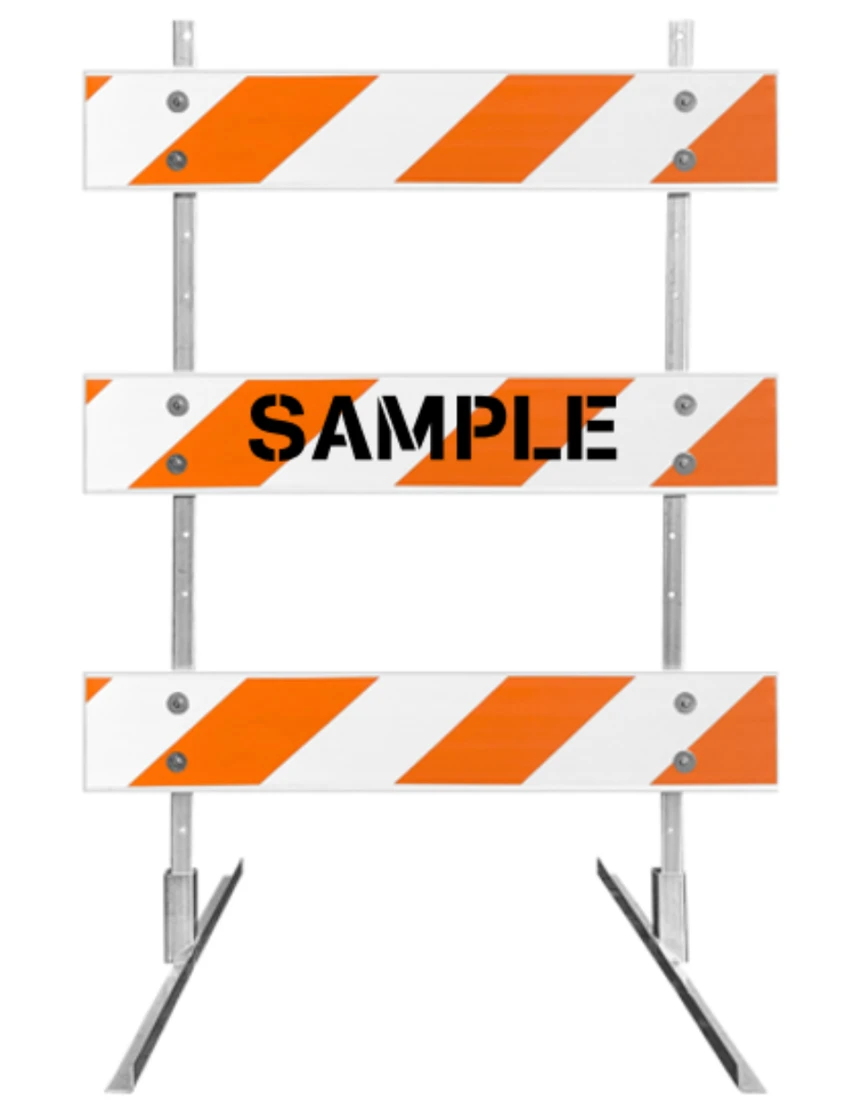 - Three (3) 4' x 8" x 1" Plastic Rails with Orange & White Reflective Sheeting (Choose Engineer Grade (EG) or High Intensity (HI) sheeting)