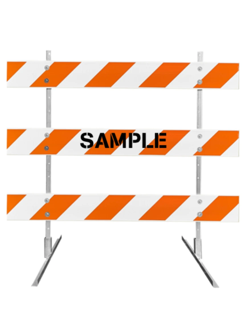 63" Tall MUTCD Type III Barricade -Square Steel Sign Post Uprights, Steel Angle Iron Feet & Three 6' Plastic Boards w/HI Sheeting On Both Sides Of Rails & Custom Lettering