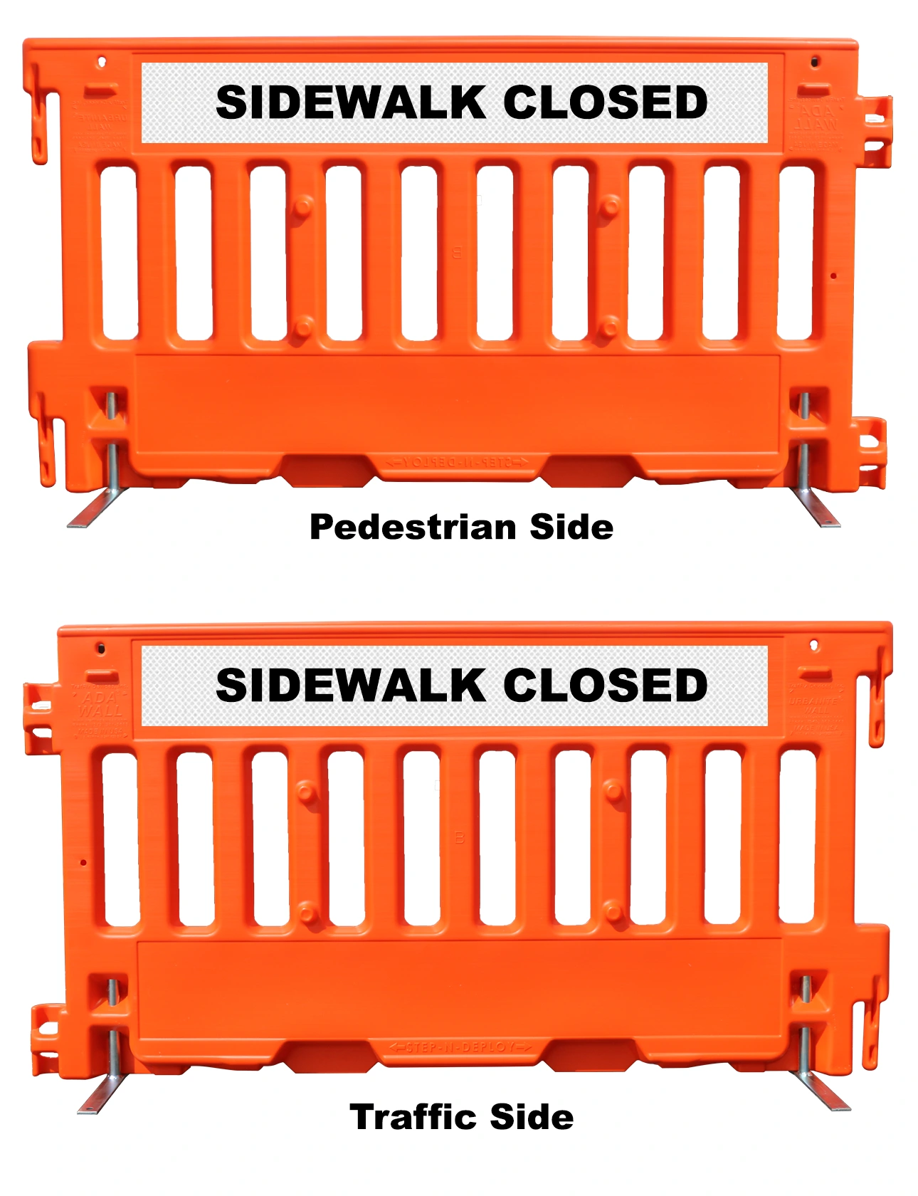 Orange, Pedestrian Wall Barricade w/ T-Legs (72" L X 3" W X 38" H) w/ High Intensity (HI) Sheeting On Top of Both Sides with SIDEWALK CLOSED on the sheeting