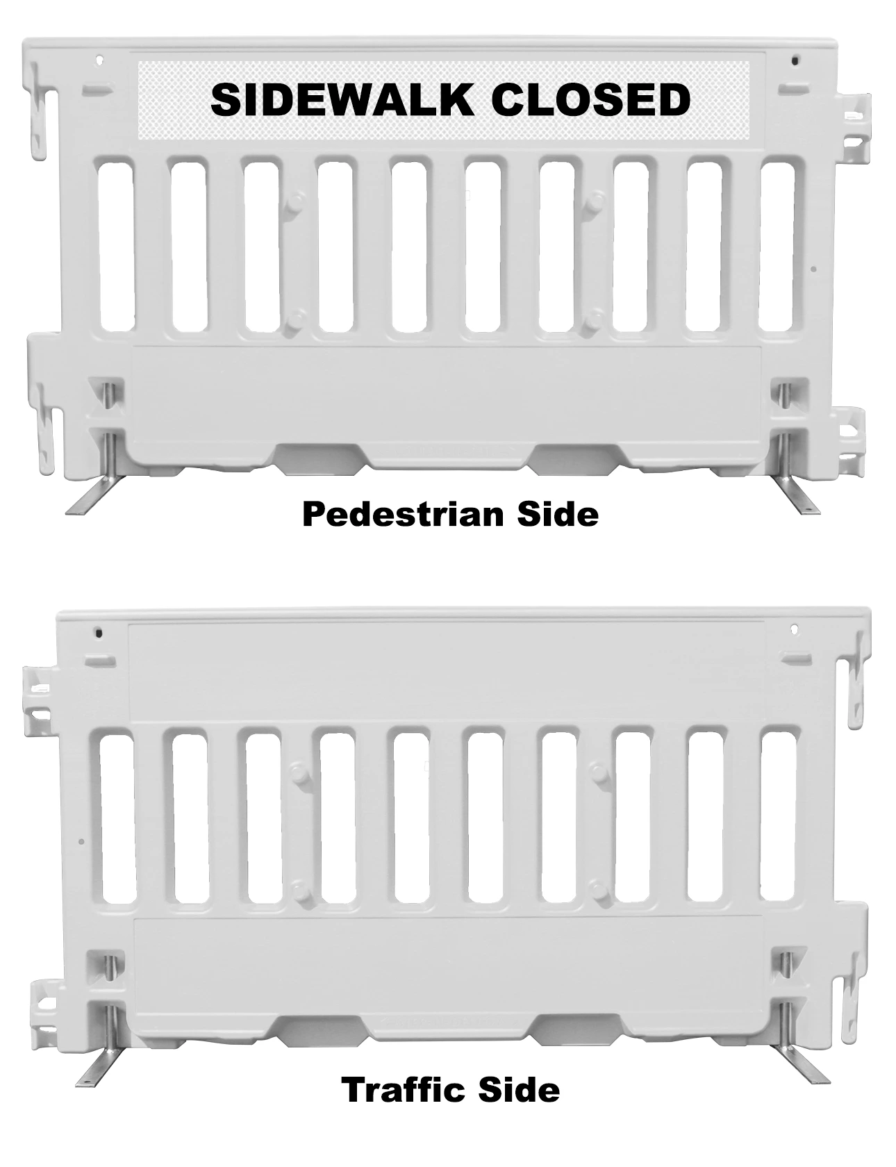 White, Pedestrian Wall Barricade w/ T-Legs (72" L X 3" W X 38" H) w/ High Intensity (HI) Sheeting On Top of One Side with SIDEWALK CLOSED on the sheeting& Bottom On Both Sides