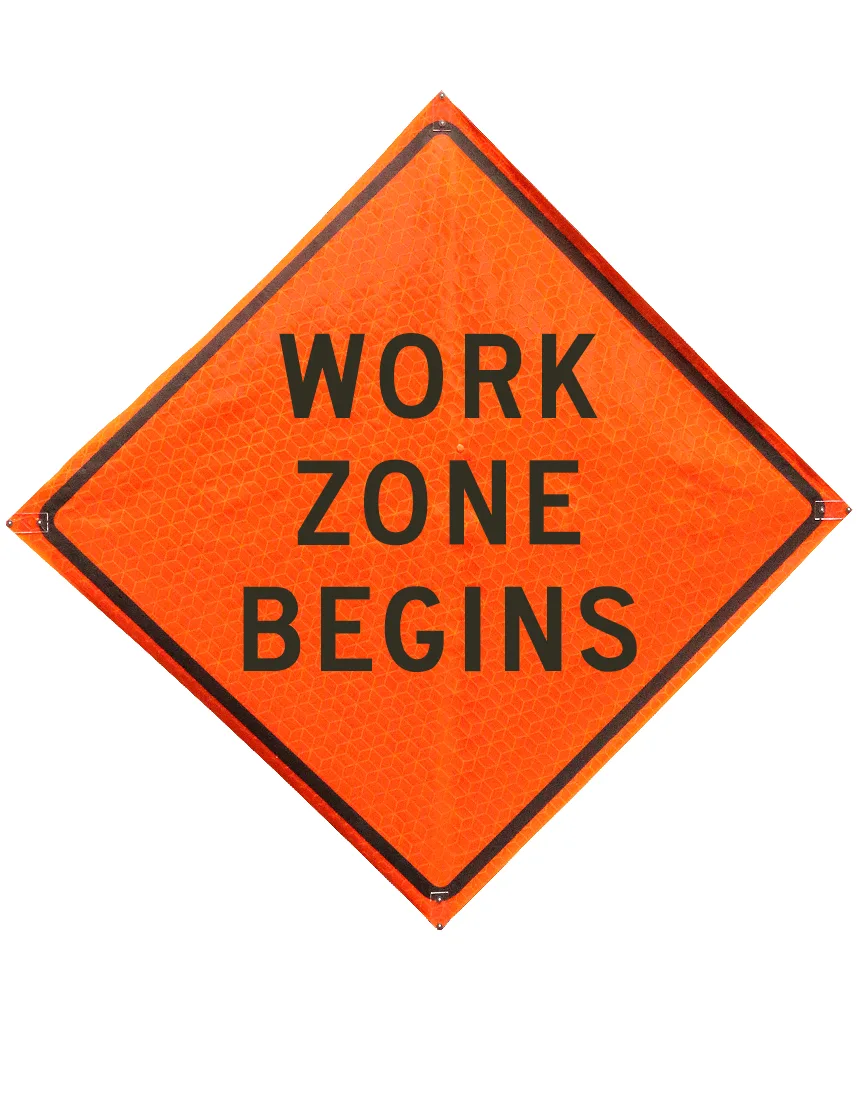 48", Marathon Reflective Roll Up Sign, WORK ZONE BEGINS