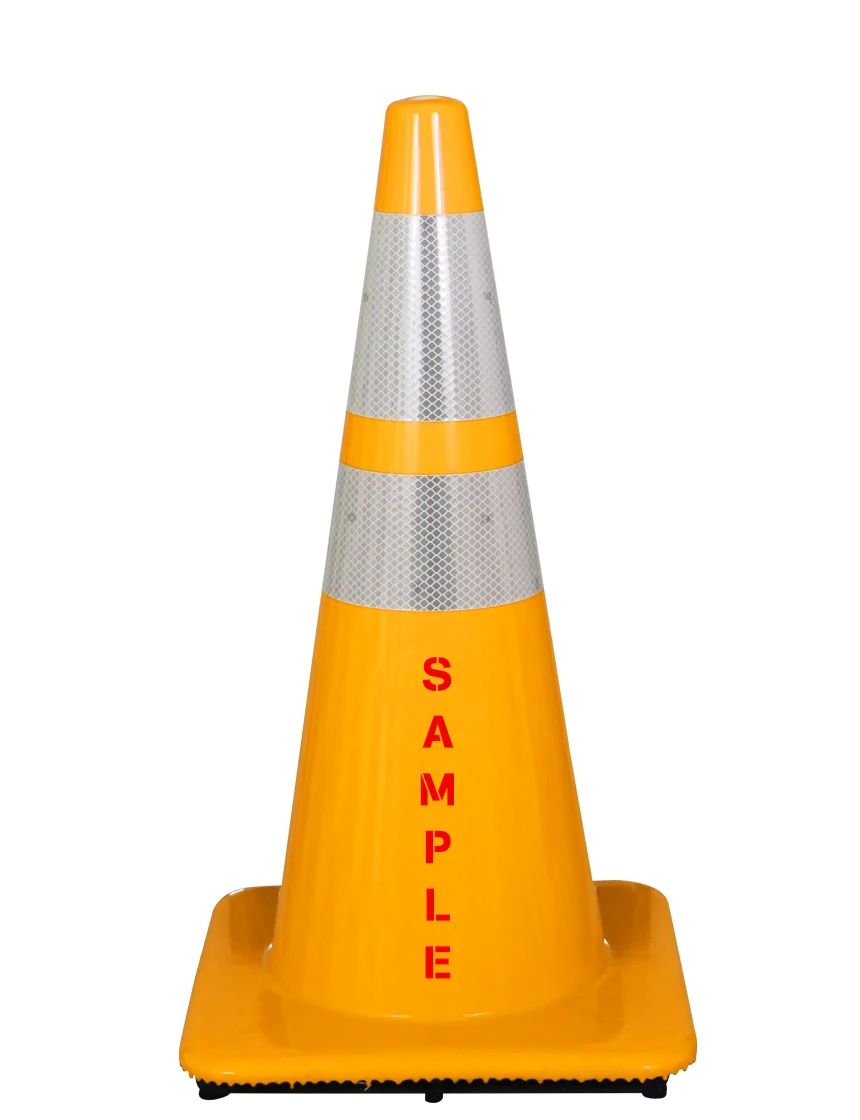 Yellow 28" Traffic Cone w/6" & 4" Reflective Collars &Double Sided Custom Lettering