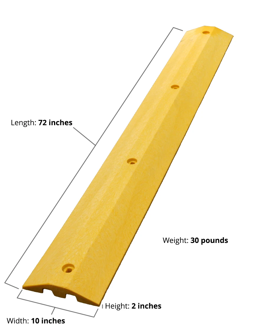 Ensure traffic safety with our 6-foot solid plastic speed bump, designed for effortless one-person transport and installation. Unlike traditional speed bumps, this fade-proof, chemical-resistant solution features bright yellow color molded directly into the material—ensuring long-lasting visibility without the need for repainting.